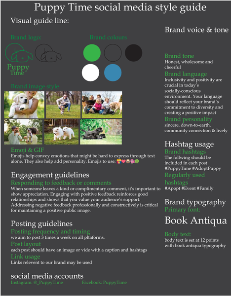 For the screen based design assignment we had to make on screen elements to promote a event. I chose to make puppy adoption event because I thought I could do a lot of interesting screen designs with this them. I made a mobile site for my puppy adoption event. This is a interactive site where you can read about the event and apply to be a part of it. I also made a Facebook and Instagram page for my puppy adoption event. And a style guide for of the colors and themes of my brand and event.